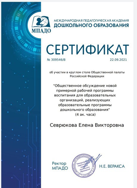 Участие в круглом столе общественной палаты Российской Федерации "Общественное обсуждение новой примерной рабочей программы воспитания для организаций, реализующих образовательные программы дошкольного образования"