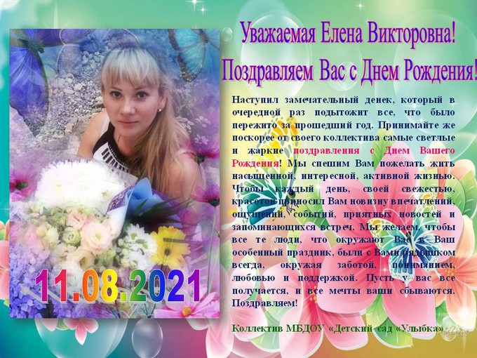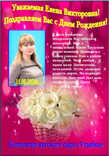 11 августа 2020 года коллектив детского сада "Улыбка" поздравил нашего руководителя Елену Викторовну с Днем Рождения! Коллектив от всей души пожелал много добрых и теплых слов. Елена Викторовна, примите самые сердечные поздравления по случаю Вашего праздника и искренние пожелания благополучия и успехов, реализации всех планов и начинаний, понимания и поддержки близких и дорогих Вам людей. От всей души желаем Вам эффективной работы на Вашем ответственном посту, больших успехов в решении насущных задач в образовательной деятельности, новых побед и достижений! Счастья Вам, здоровья и долгих лет активной жизни!