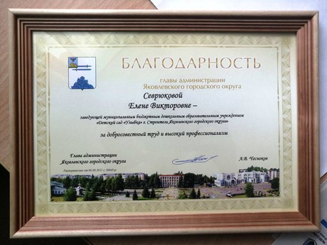 Глава администрации Яковлевского городского округа Чесноков Андрей Валериевич ко дню юбилея вручил заведующему Елене Викторовне благодарность за добросовестный труд и высокий профессионализм.