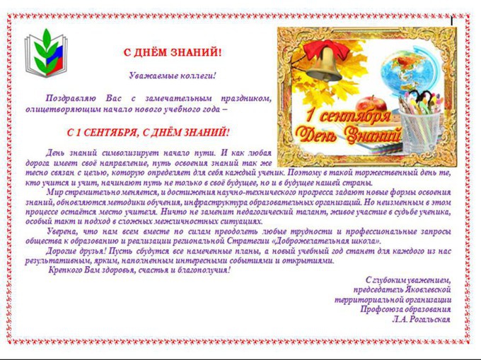 Поздравление с "Днем Знаний!" от председателя Яковлевской организации Профсоюза образования Рогальской Л.А.