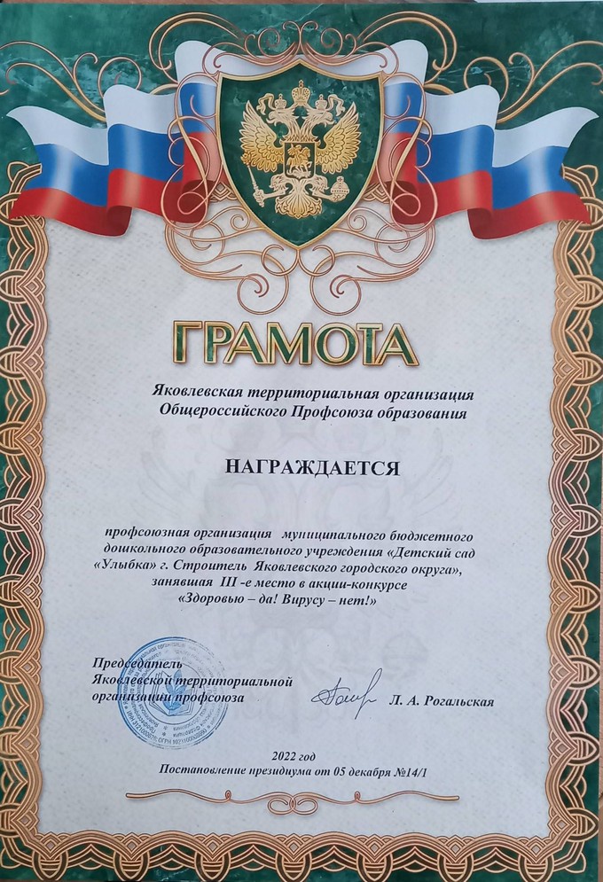 В рамках профсоюзной АКЦИИ-КОНКУРСА "ЗДОРОВЬЮ -ДА! ВИРУСУ-НЕТ!" МБДОУ "Детский сад "Улыбка" заняли III место. Поздравляем!