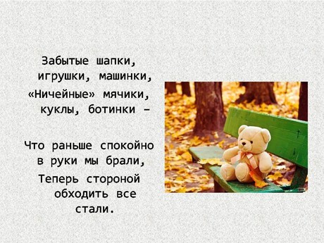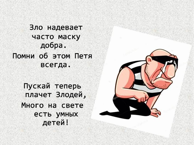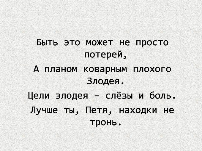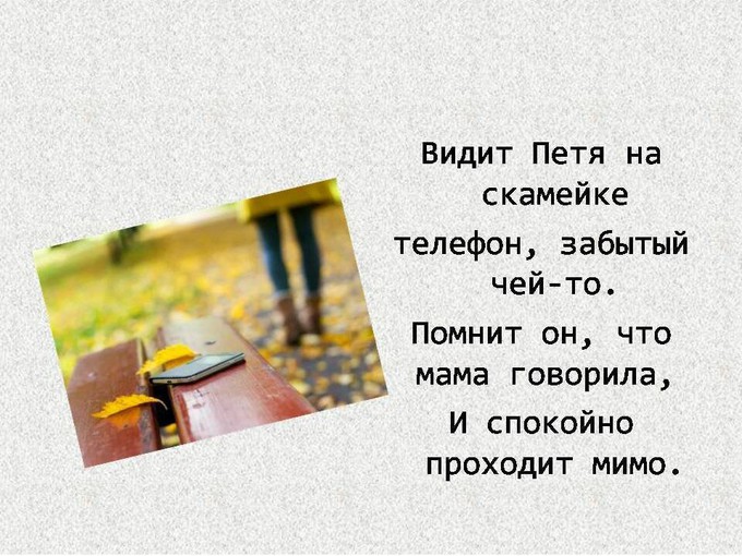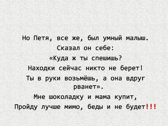 Например: Стихотворение про мальчика Петю. Но на их примере становится понятно, что шаблоны поведения в обществе изменились. Теперь нельзя брать незнакомые предметы в руки, от слова «совсем». Дети и взрослые должны обходить стороной все забытые кем-то вещи.