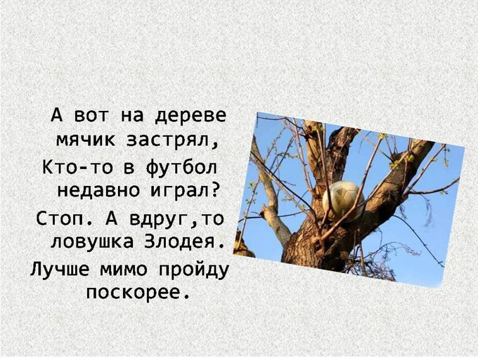 Вот это же стихотворение о том, что нельзя брать в руки незнакомые предметы в руки, в формате презентации. Его можно прочитать вместе с ребенком, рассмотреть иллюстрации и обсудить ключевые моменты: