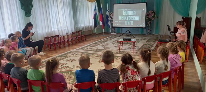 В рамках проведения мероприятий, посвященных годовщине Прохоровского танкового сражения воспитанникам «Детского сада «Улыбка» г.Строитель» педагоги показали короткометражный фильм «Великая война. Курская битва». История Великой Отечественной войны 1941-1945 годов – это судьбы многих миллионов жителей нашей Родины, отстоявших честь и независимость страны, проявивших беспримерное мужество и героизм в боях с фашистскими захватчиками. Курская битва – одно из самых крупнейших и самых важных сражений Великой Отечественной Войны. Немецкое командование дало другие название этой битвы – операция «Цитадель», которая по планам вермахта должна была контратаковать советское наступление. Параллельно после обсуждений в Генштабе РККА и Ставке ВГК по данным разведки было решено сначала выбить вражеские танки, измотать противника в оборонительных сражениях и лишь затем самим перейти в наступление. Общее преимущество перед Курской битвой было у советских войск! Чудеса храбрости и самопожертвования проявляли на Курской дуге наши танкисты, пехотинцы, артиллеристы, лётчики. Прохоровское сражение стало безусловной победой Красной Армии. 5 августа Красная Армия освободила Орёл и Белгород. Это было наглядным свидетельством того, что вся германская группировка под Курском потерпела полный крах. Тем же вечером в Москве был дан первый артиллерийский салют — 12 залпов из 124 орудий — в честь доблестных войск, одержавших славные победы.