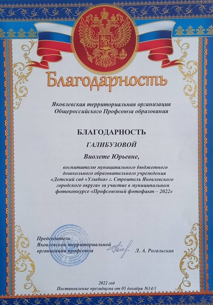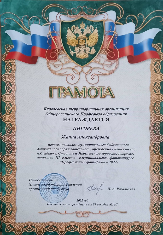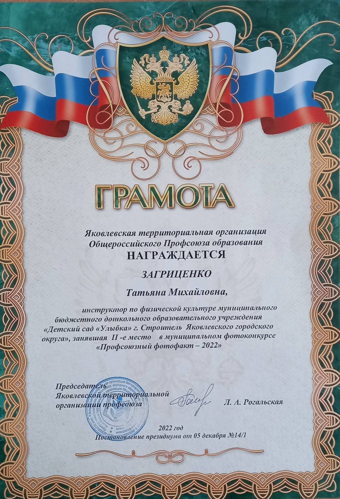Муниципальный фотоконкурс "Профсоюзный фотофакт-2022" проведен в рамках реализации плана мероприятий Яковлевской территориальной организации Профсоюза образования тематического Года "Корпоративная культура Профсоюза", федерального проекта Общероссийского Профсоюза образования "Профсоюз-территория здоровья" Педагоги детского сада "Улыбка" активно приняли участие в данном конкурсе: Пигорева Ж.А., педагог-психолог. Направление работы: "Охрана труда"(Грамота III место), Загрыценко Т.М., инструктор по физической культуре. Направление работы: «Профсоюз – территория здоровья» (Грамота II место). Галибузова В.Ю., воспитатель. Направление работы - «Мотивация профсоюзного членства» (Благодарность). Поздравляем наших педагогов и желаем творческих успехов!