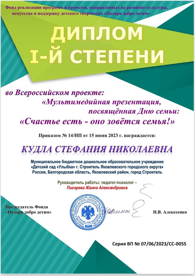 Результаты участия во всероссийском проекте "Мультимедийная презентация, посвященная Дню семьи: "Счастье есть - оно зовется семья" В проекте приняла участие семья Кудла Стефании, подготовительная группа, под руководством Пигоревой Ж.А., педагога-психолога. Желаем дальнейших творческих успехов!