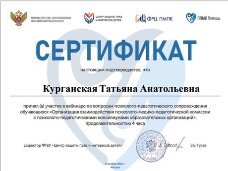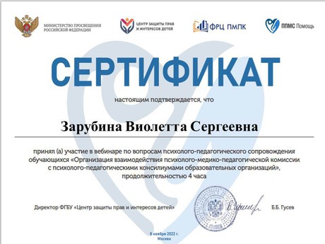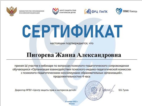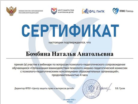 8 ноября прошел вебинар "Организация взаимодействия психолого-медико-педагогических комиссий и психолого-педагогических консилиумов образовательных организаций", в котором приняли участие педагоги МБДОУ "Детский сад "Улыбка", по завершении вебинара участники получили сертификаты. Данный вебинар был актуальный и полезный. Спасибо организаторам и выступающим педагогам!