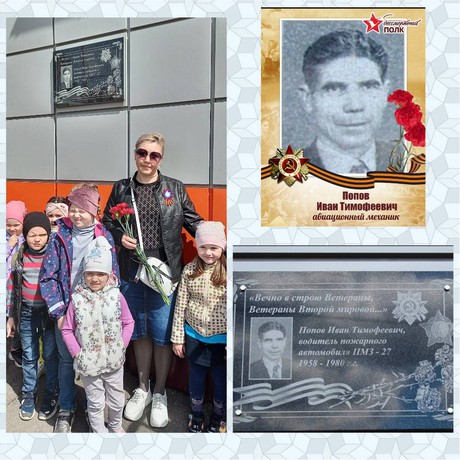 Попов Иван Тимофеевич является родным дедушкой Жанны Александровны Пигоревой нашего педагога-психолога детского сада "Улыбка". В преддверии 9 мая, она рассказала детям, что ее дедушка в годы Великой Отечественной войны в составе артиллерийских войск Северо-Западного фронта принимал участие в героической обороне Ленинграда. В должности авиационного механика воевал в составе Юго-Западного фронта на территории Литвы и Венгрии. Победу Иван Тимофеевич встретил во Львове. Награжден орденом «Отечественной Войны II степени», медалями «За отвагу», «За боевые заслуги», «За победу над Германией», «За оборону Ленинграда». Память ветерана войны почтили минутой молчания.