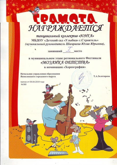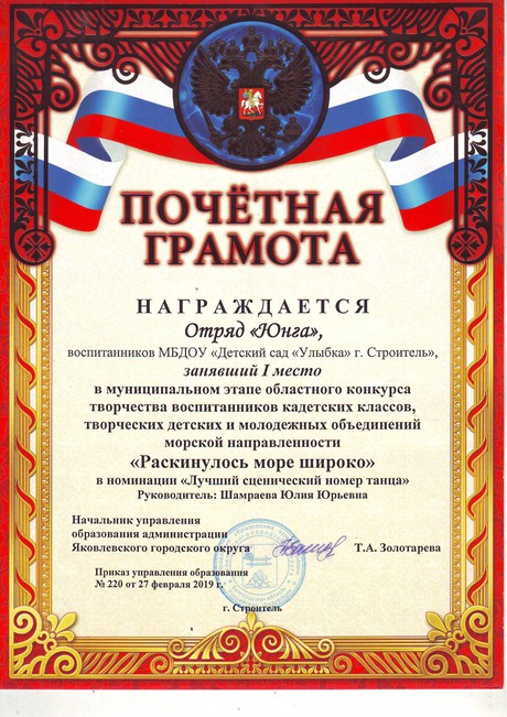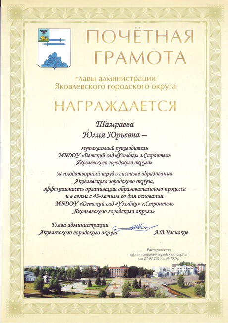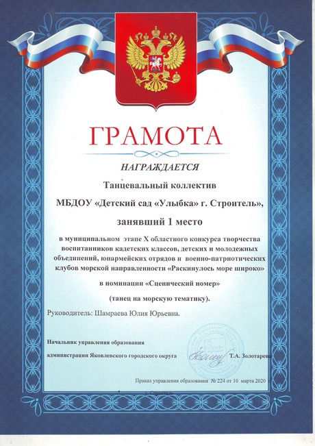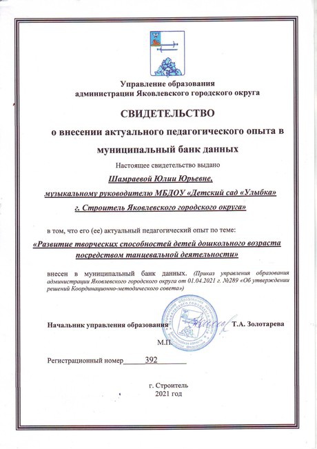 Актуальный педагогический опыт «Развитие творческих способностей детей дошкольного возраста посредством танцевальной деятельности» обобщён на муниципальном уровне (Приказ управления образования администрации Яковлевского городского округа от 01.04.2021 г. № 289 «Об утверждении решений координационно-методического совета»)