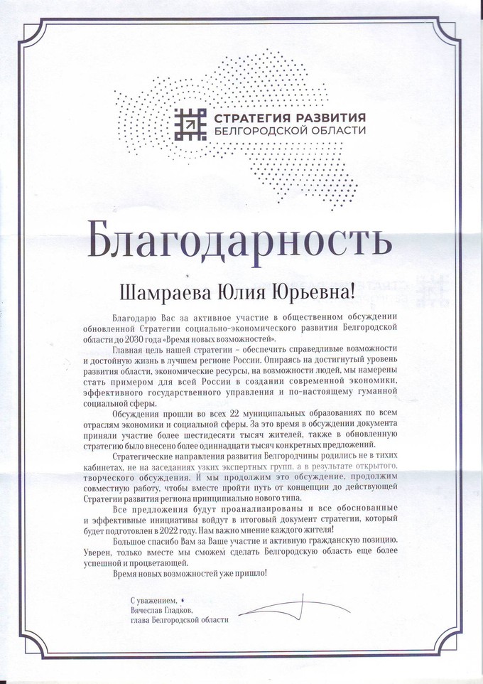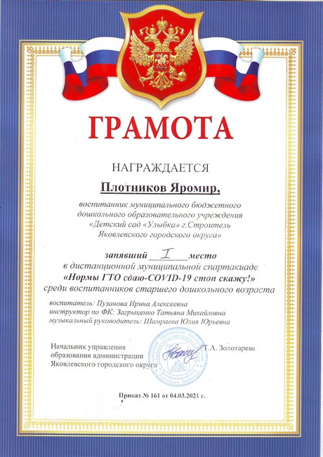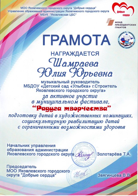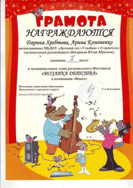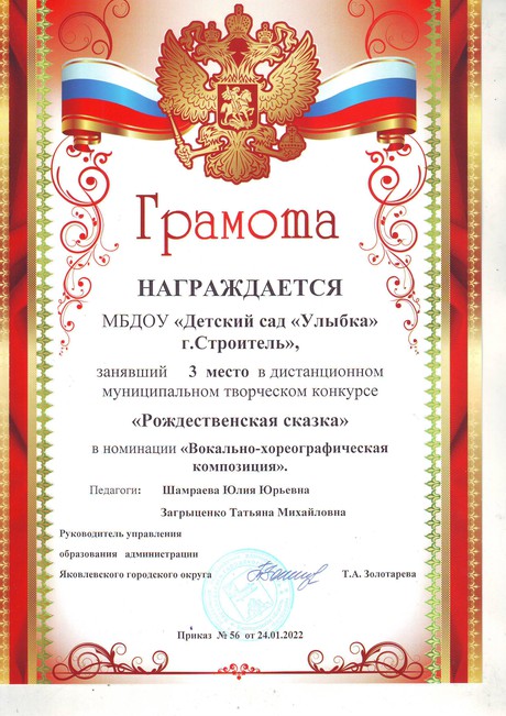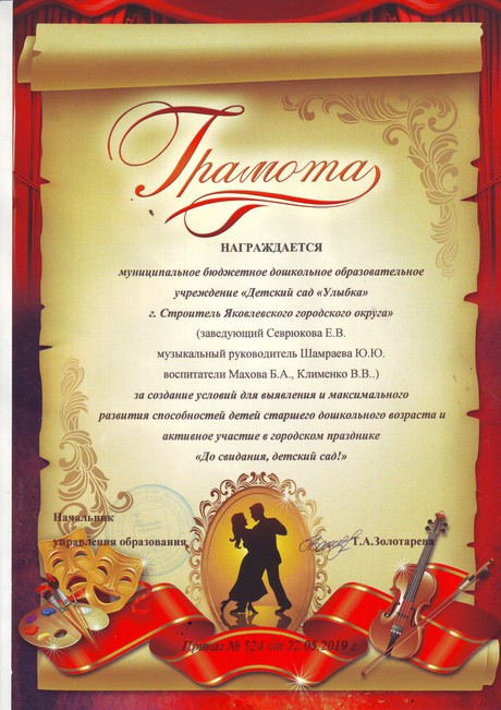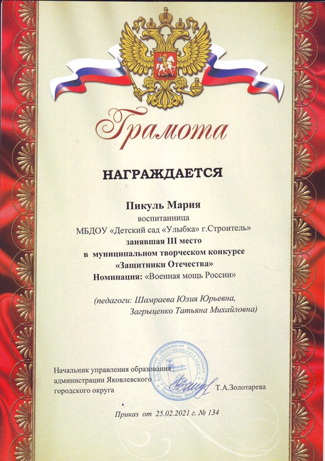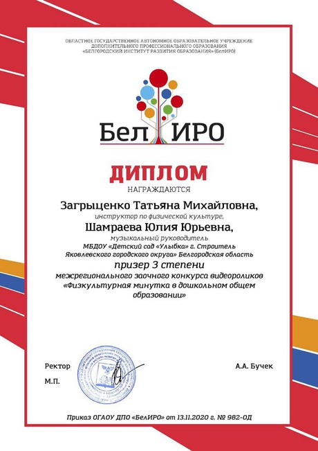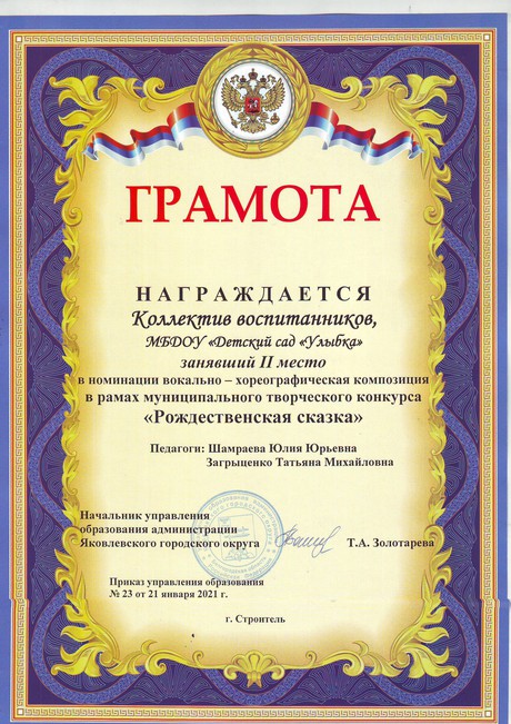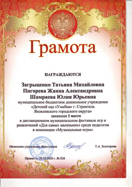 Квалификационная категория: высшая по должности музыкальный руководитель (приказ Департамента образования Белгородской области №3749 от 21.12.2021 г.)