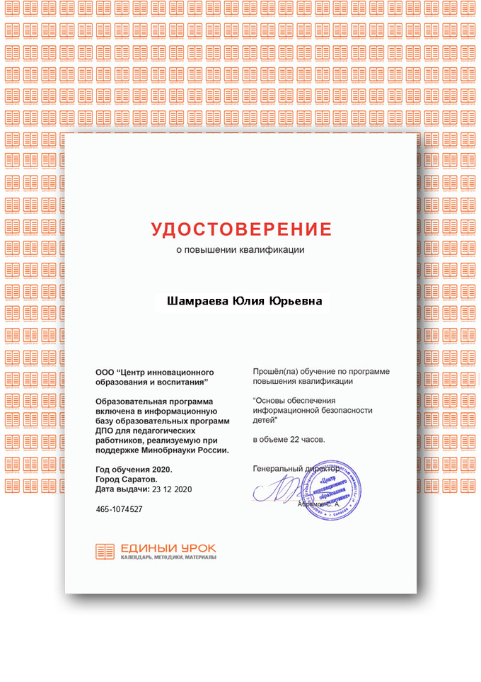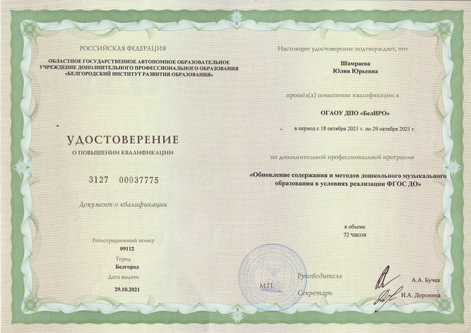 - прошла повышение квалификации в ОГАОУ ДПО «Белгородский институт развития образования» в период с 18 октября 2021 года по 29 октября 2021 года по дополнительной профессиональной программе «Обновление содержания и методов дошкольного музыкального образования в условиях реализации ФГОС ДО» в объёме 72 часов