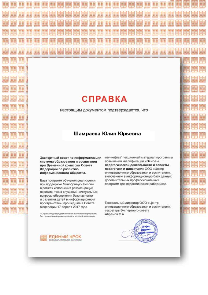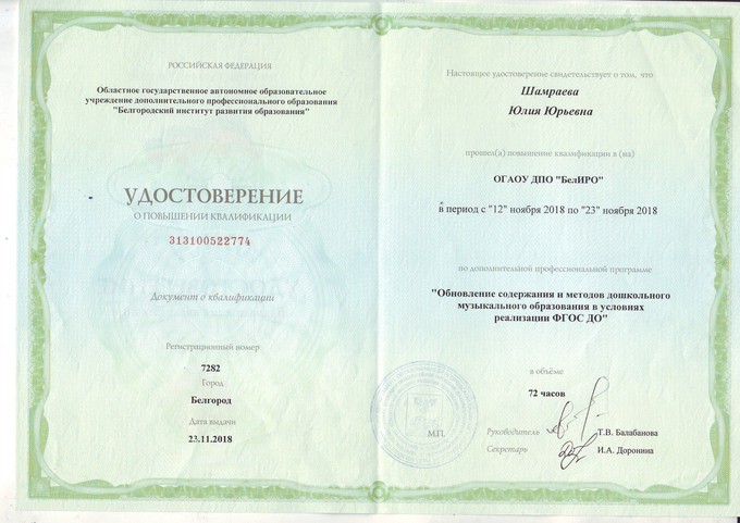 - прошла повышение квалификации в ОГАОУ ДПО «Белгородский институт развития образования» в период с 12 ноября 2018 года по 23 ноября 2018 года по дополнительной профессиональной программе «Обновление содержания и методов дошкольного музыкального образования в условиях реализации ФГОС ДО» в объёме 72 часов