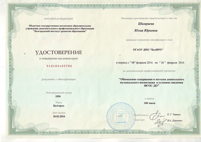 - прошла повышение квалификации в ОГАОУ ДПО «Белгородский институт развития образования» в период с 08 февраля 2016 года по 26 февраля 2016 года по дополнительной профессиональной программе «Обновление содержания и методов дошкольного музыкального образования в условиях реализации ФГОС ДО» в объёме 108 часов