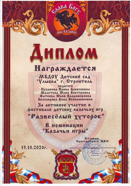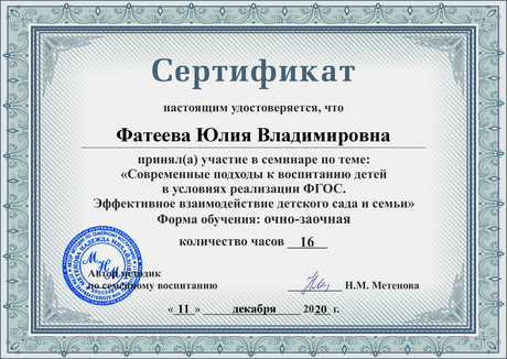 - прошла повышение квалификации в ОГАОУ ДПО «Белгородский институт развития образования» в период с 7 мая 2018 года по 6 июня 2018 года по дополнительной профессиональной программе «Содержание и организация образовательной деятельности в условиях реализации ФГОС дошкольного образования» в объёме 40 часов.