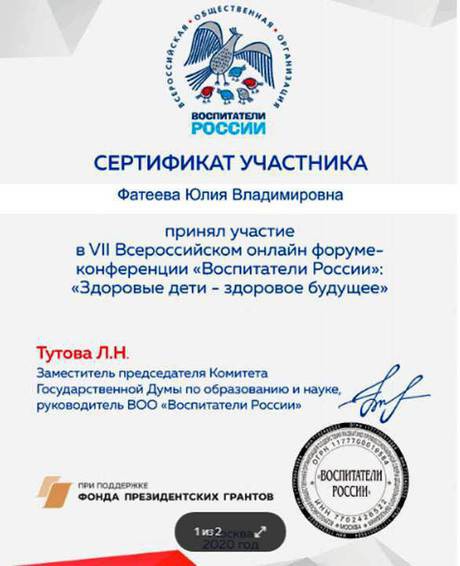 Наименование направления подготовки и (или) специальности: образование высшее, Курский государственный университет. Присуждена квалификация воспитатель, специализация «Педагогика и методика дошкольного образования» 2018г.