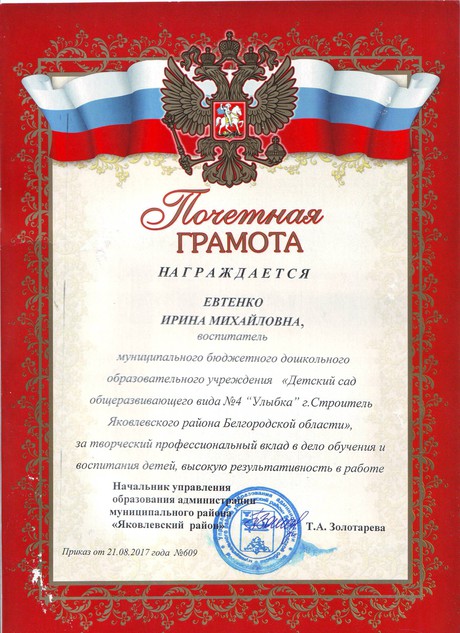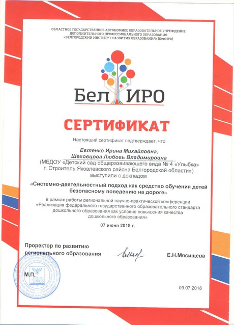 - прошла повышение квалификации в ОГАОУ ДПО «Белгородский институт развития образования» в период с 13 апреля 2020 года по 12 мая 2020 года по дополнительной профессиональной программе «Содержание и организация образовательной деятельности в условиях реализации ФГОС дошкольного образования» в объёме 72 часов.